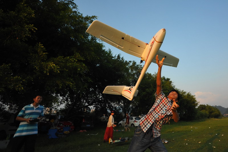 9月20日,在西江南岸草坪上,兩名少年航模愛(ài)好者放飛裝有航拍裝置的遙控飛機(jī)。何鎏/攝