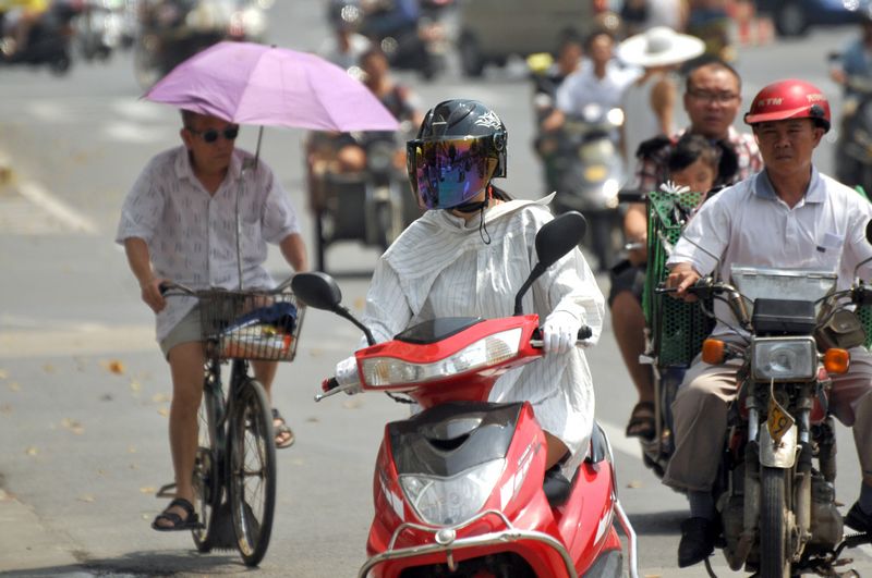 ?9月21日,穿戴全副防曬裝備的市民駕駛摩托車行駛在新興三路上。當天,我市最高氣溫達到35℃。連日來,我市氣溫居高不下,“秋老虎”的強勢發威使人們連呼“難頂!”。 西江都市報記者 蒙紹松/攝