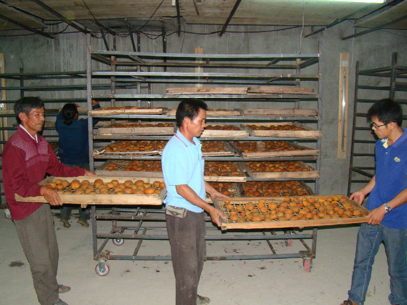 ????9月25日,在蒙山縣新圩鎮(zhèn)古定村古皮組,村民把柿子搬進(jìn)烤房烤制柿餅。
