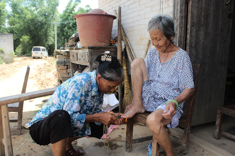 石秀平(左)在為婆婆剪指甲。
