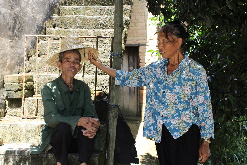 石秀平給盧華基老人(左)戴上一頂草帽遮陽。