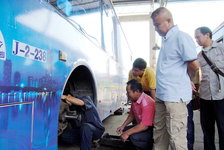 ?9月27日,技術(shù)工人在安檢人員的監(jiān)督下,對公交車進行保養(yǎng)維修。梧州珍寶巴士公司將每月的安全生產(chǎn)大檢查和節(jié)假日安全重點檢查列為重要工作內(nèi)容,每次都由公司領(lǐng)導(dǎo)帶隊,到各公交線路進行督查,從源頭上抓好安全工作。 黃健泉 攝