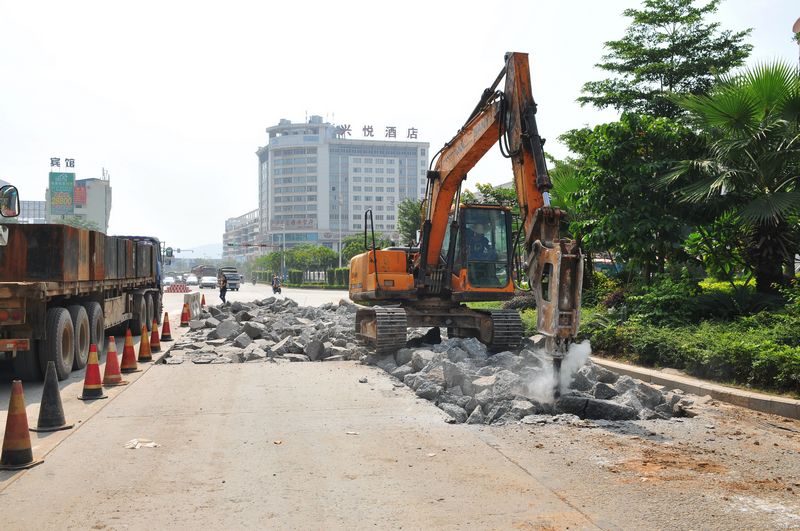 9月28日,在紅嶺路,施工機械正在開鑿破爛的路面。