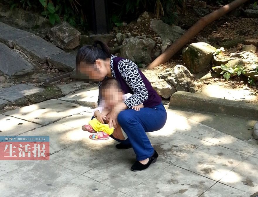 一位母親在路邊給孩子把尿。(來源:廣西新聞網-當代生活報)