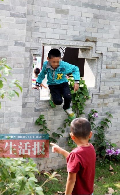 一位小朋友從一處窗口竄出。(來源:廣西新聞網-當代生活報)