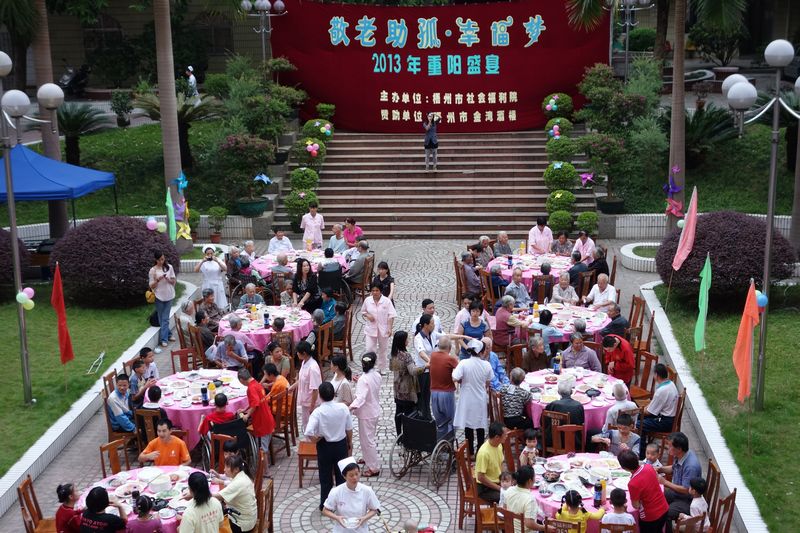 昨天,在梧州市福利院小廣場,12張大圓桌依次擺開。居住在院里的上百名老人、兒童在工作人員和志愿者的陪同下,享受著金灣酒樓為他們準備的“百人宴”,提前歡度重陽節(jié)。吃著豐盛的菜肴,看著舞臺上的表演,拉拉家常,碰碰酒杯,老人們樂開了顏。