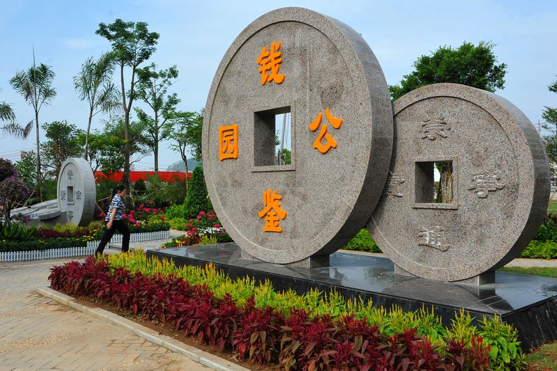 ????10月7日,記者在錢鑒公園看到,有兩組大小不一的銅錢雕塑矗立在公園入口。據園林實業綜合開發公司的工作人員介紹,為了更好地表現梧州錢鑒的歷史,公園的入口景觀標志的元素,取用的是從梧州出土的宋代銅錢。用花崗巖裝飾,則展現出了一股古風古韻。記者看到,在左邊的景觀標志,以一塊高約4米的大銅錢作為主景,仿照出土銅錢上字體的書寫風格和模式,在其上雕刻上公園名稱“錢鑒公園”4個大字。在大銅錢兩旁,一前一后搭配兩個小銅錢,上面則分別雕刻上“崇寧重寶”和“熙寧重寶”的字樣。