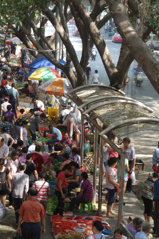 每天清晨,新興菜市入口處都像一座“圍城”:里面的人想出來,外面的人想進(jìn)去。該局面的形成并不是因?yàn)槿肟诘缆返膶挾炔粔颍且驗(yàn)榈缆飞嫌刑嗟臄倷n占道經(jīng)營。類似的情況,還長期存在于市內(nèi)各大市場的周邊。