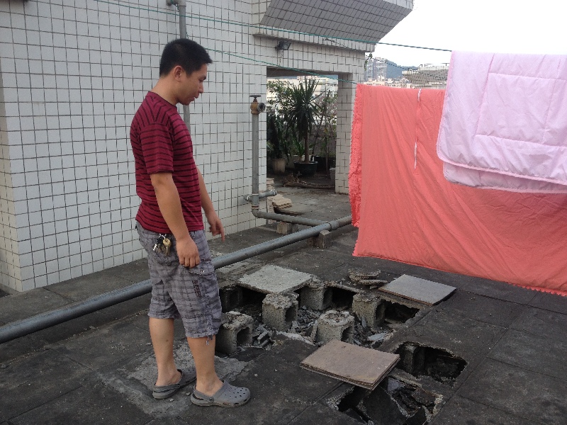 ????10月14日下午6時許,記者隨何先生來到華洋花園3號樓天臺看到,部分隔熱板連片破損,隔熱板底下的承重磚裸露在地面。何先生表示,因害怕走路太使勁會把隔熱板踩爛,現在走上天臺晾曬衣物都得小心翼翼。隨后,記者在何先生家中看到,廳堂、廚房、房間等地的天花板泛黃且出現細長裂紋,裂紋周邊有水漬。