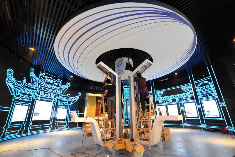 ?10月20日,在梧州市城市規(guī)劃展覽館內(nèi),一個(gè)以梧州龍母文化為主題的展廳正在進(jìn)行最后的裝修工作。當(dāng)日,記者在位于舜帝大道的梧州市城市規(guī)劃展覽館了解到,展覽館內(nèi)的裝修進(jìn)入沖刺階段,各個(gè)主題展區(qū)的主體布景已經(jīng)完成,工人們正在進(jìn)行最后的燈光安裝,據(jù)悉,位于展覽館內(nèi)的毅德城招商中心在當(dāng)日已經(jīng)投入使用,展覽館的布展工作預(yù)計(jì)將在本月25日前后完成。