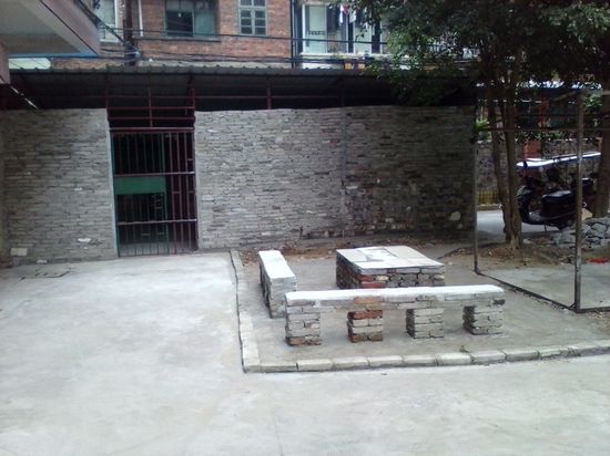 東山沖32、32—1棟居民樓綠化帶盡頭處新建起了一處車庫,車庫外面則搭建起供人休息的石凳石桌。(紀榮蘭/攝)