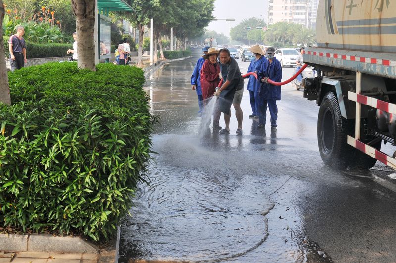 ?10月22日上午,工人們在沖洗我市西堤二路。近段時間,市環衛部門派出專門人員,陸續清洗市內各主要街道,要以干凈整潔的城市面貌迎接第十屆梧州國際寶石節的到來。 李鴻榮/攝