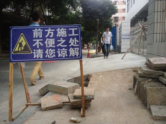 當時,兩名施工人員正在人行道上鋪設地磚。人行道前方拉起警戒線,同時放置了標注“前方施工不便之處請您諒解”字樣的警示牌。牌上貼出一份加蓋市市政管理局行政審批專用章的《城市道路挖掘施工許可證》。