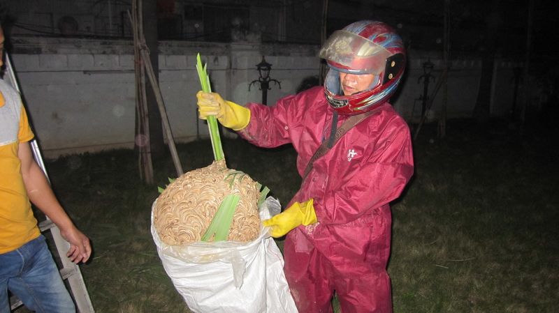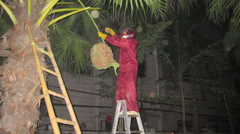 當(dāng)晚,記者在現(xiàn)場(chǎng)看到,這個(gè)蜂窩比籃球還大,蜂窩外有幾只“豹兒蜂”在“巡邏”。專業(yè)人員介紹說(shuō),“‘豹兒蜂’白天活動(dòng)能力太強(qiáng),不容易靠近,因此晚上是摘除蜂窩的最好時(shí)機(jī)。”在拆除蜂窩前,專業(yè)人員先用濕泥將蜂窩的出口堵住,再通過(guò)修剪樹枝使蜂窩完全露出,最后用塑料袋把蜂窩套住,與樹枝一并砍下。