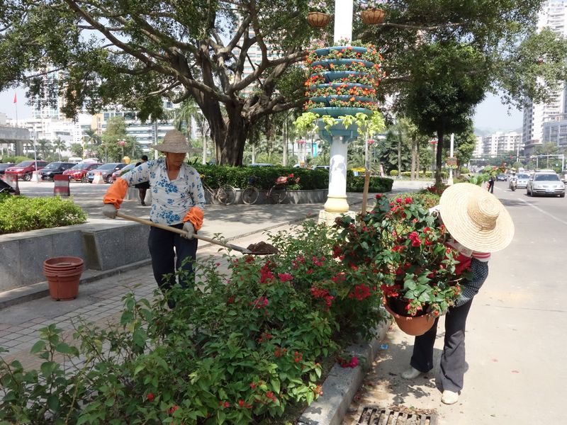 ????10月25日,園林工人在奧奇麗路兩旁的花基增種寶巾花。