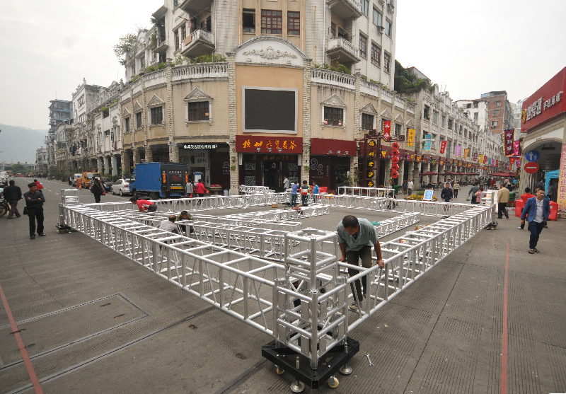 ??? 10月28日,工作人員在騎樓城內(nèi)特色小吃街路口搭建鋼架舞臺。當(dāng)天,嶺南美食節(jié)主舞臺開始搭建。據(jù)悉,嶺南美食節(jié)期間,一系列文藝表演及騎樓形象大使決賽等活動將在此進行。 西江都市報記者 蒙紹松/攝