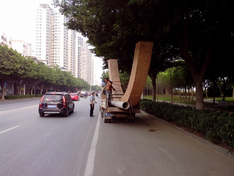 ????然而,不知道是什么原因,讓駕駛員和運貨的工人冒著生命的危險作出這樣的舉動。交警通過了解,這個巨型的“月亮船”木樁是附近某樓盤商業活動用于搭建舞臺的,活動結束后就找了運輸公司運走。為了圖方便和節省資質,被沒有租用大型的貨車運送,就找了這輛小貨車將木樁送離。駕駛員表示,自己也只是打工的,老板叫自己來運貨,自己也沒有考究那么多,就是趕緊把活干完。