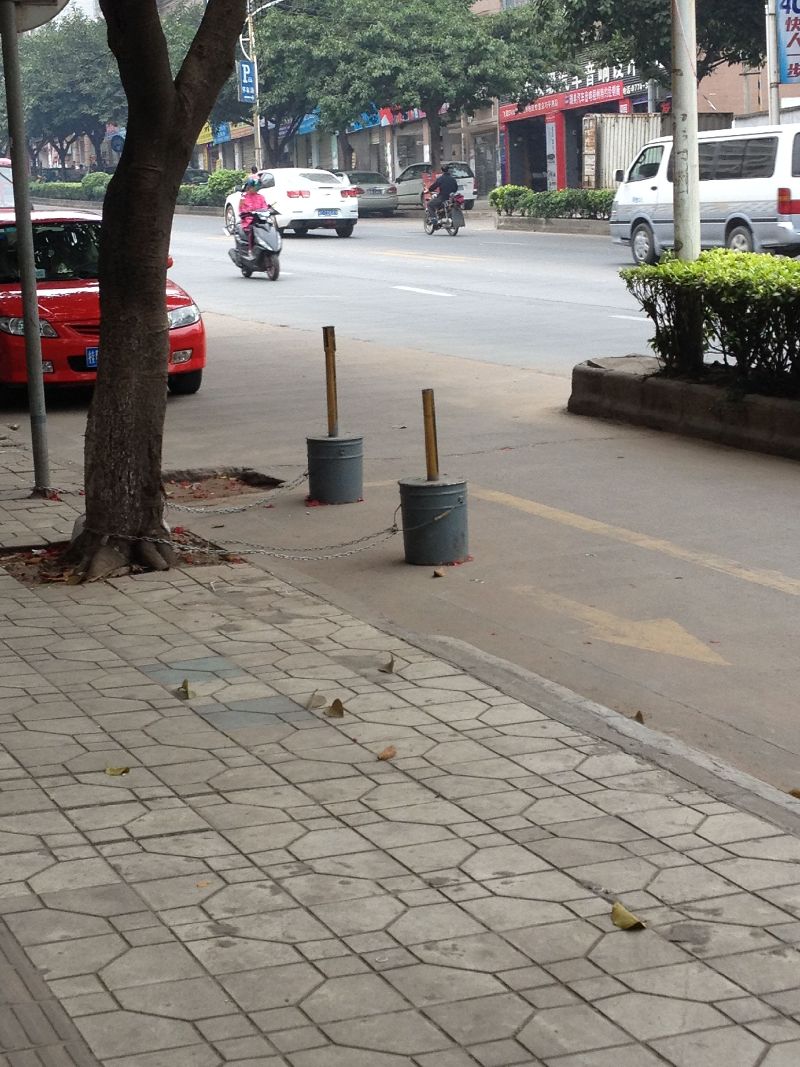 ????此外,一些商鋪還在門前橫向停泊摩托車。記者觀察到,雖然周圍并沒有小汽車專用車位的標志牌,但此舉無疑阻礙了其他車輛的停放。在西環路上,有商家甚至用鐵鏈把水泥墩鎖在車位旁的樹木上,以阻止司機將障礙物挪開。