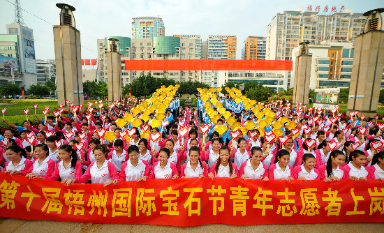 ????西江都市報訊(記者 楊珊)昨日下午,第十屆梧州國際寶石節青年志愿者上崗儀式在市政廣場舉行。來自市內各院校的600多名志愿者,高呼“寶石耀梧州,志愿展魅力;十年志愿路,精彩有你我”的口號,以飽滿的精神走上服務崗位。