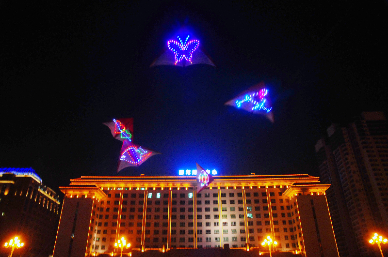 首次在我市亮相的大型燈光風箏在市政廣場上空放飛。