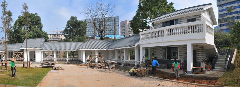 ?11月6日,錢鑒小游園的中式長廊拆下腳手架,工人正進行裝修和綠化等收尾工作。這道曲尺型中式長廊是錢鑒小游園的景觀性休閑區,全面建成開放后,公園的設施和功能將進一步提升。