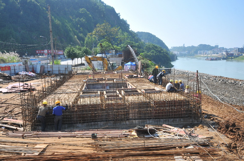 ????11月15日,在桂江二橋東橋頭附近,工人正在污水提升泵站沉井的頂部施工。