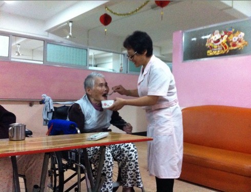藍天頤養院護工人手不夠,院長佘婉冰也來幫忙為老人喂水。