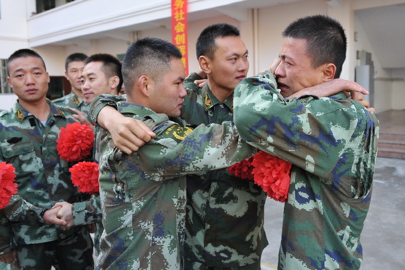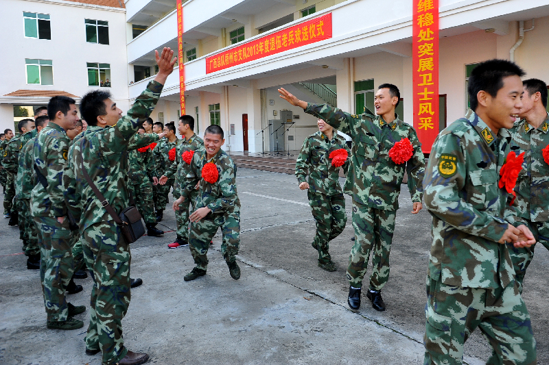 ????11月25日,在武警梧州市支隊軍營,服役期滿的戰士們相互道別、祝福。