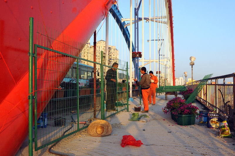 ??? 11月25日,施工人員在鴛江大橋的人行道上安裝隔離欄。隔離欄的安裝,將使市民在大橋人行道的通行更加安全有序。據了解,鴛江大橋人行道改造工程已進入收尾階段。西江都市報記者 蒙紹松/攝