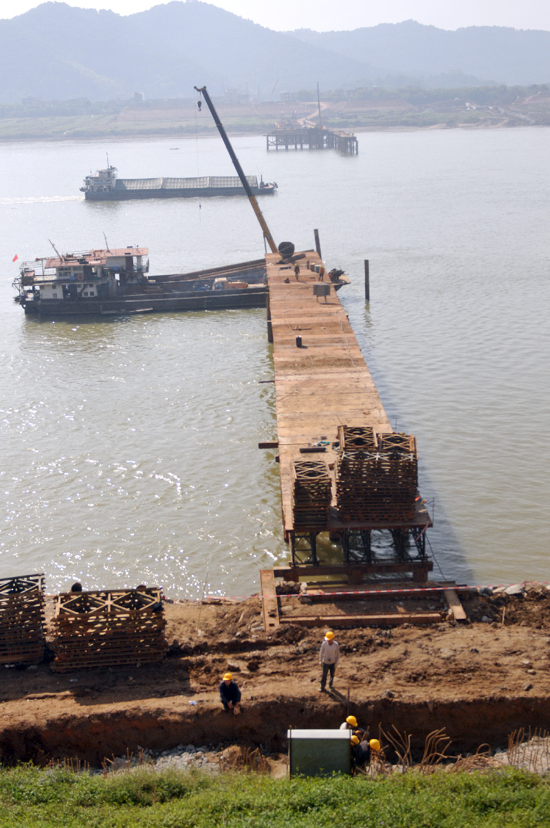 ??? 11月30日,西江四橋北岸,一條施工便橋正從岸邊向江心方向延伸。日前,位于河西老碼頭公園附近的西江四橋北岸開始施工,施工方開始搭建施工便橋,為構(gòu)筑江心橋墩施工平臺做前期準備。西江四橋南岸、北岸同時施工將有力地推進大橋的工程進度建設(shè)。 西江都市報記者 蒙紹松/攝