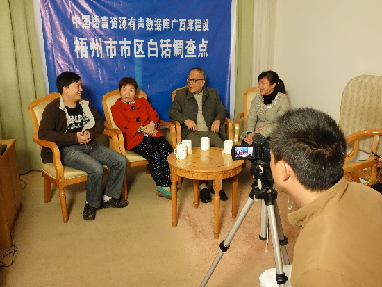 ????在錄音錄像現(xiàn)場(chǎng),66歲的陳冠中、63歲的梁煥珍、38歲的譚志鴻、37歲的譚慶蓮,分別作為老年男性、老年女性、青年男性、青年女性的漢語方言發(fā)音人,組成了中國(guó)語言資源有聲數(shù)據(jù)庫(kù)廣西庫(kù)梧州市區(qū)白話調(diào)查點(diǎn)的四人發(fā)音小組。現(xiàn)場(chǎng)錄音內(nèi)容分為集體項(xiàng)目和個(gè)人項(xiàng)目?jī)深悾渲屑w項(xiàng)目是四位發(fā)音人根據(jù)梧州的地域文化、風(fēng)俗習(xí)慣、傳統(tǒng)節(jié)日等內(nèi)容進(jìn)行自由對(duì)話,時(shí)間約40分鐘;個(gè)人項(xiàng)目是用梧州白話自然講述《牛郎織女》的故事,每人約20分鐘。此外,老年男性發(fā)音人的發(fā)音項(xiàng)目還包括用白話讀1000個(gè)字、1200個(gè)詞語、50個(gè)句子。