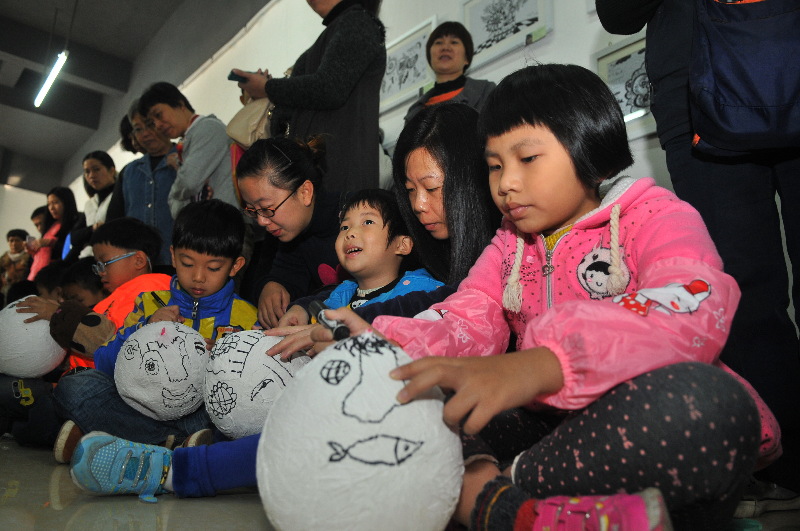 ????12月1日,在市群眾藝術(shù)館展覽廳,孩子們正在繪制手工裝飾品。