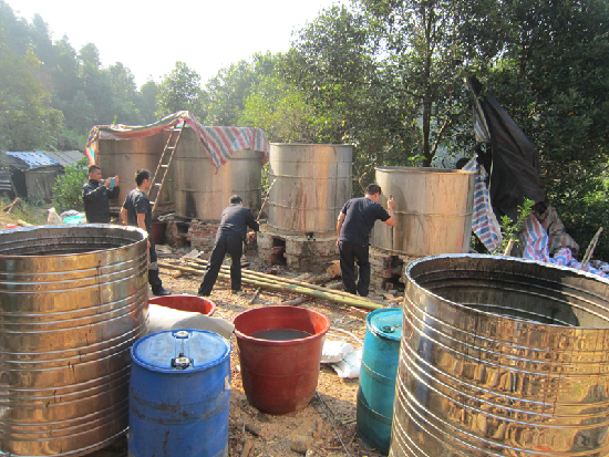 ????經審訊,犯罪嫌疑人王×、吳×均對其制毒的違法犯罪行為供認不諱。據犯罪嫌疑人王×交代,為滿足平日吃喝玩樂開銷,總想大發橫財,便與吳×一拍即合,密謀在平福鄉的深山里,搭蓋起簡易工棚,偷偷搬運各種制毒原料到此,欲將制毒原料提煉成毒品進行販賣。為了掩人耳目,逃避打擊,故選在偏遠的山區作案,對外聲稱在此處“煎熬中藥”,以此來掩蓋制毒過程中散發出來的難聞氣味,結果,毒品還沒煉成就被民警一鍋端了。