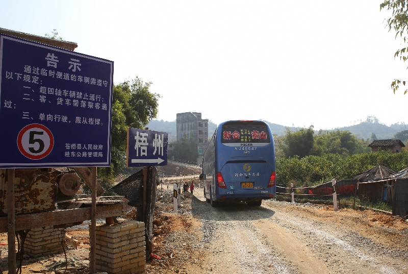 ????經(jīng)市政府、蒼梧縣政府有關(guān)部門及桂東公路管理局協(xié)調(diào),為保障省道323線嶺腳中橋維修期間公路的安全暢通,桂東公路部門正式接管省道323線嶺腳中橋維修期臨時便道,并實行免費通行。臨時便道路窄彎急,實行單向行駛,禁止超四軸車輛通行,乘客需下車通行。葉桂如 攝