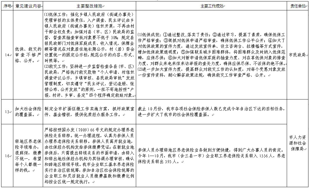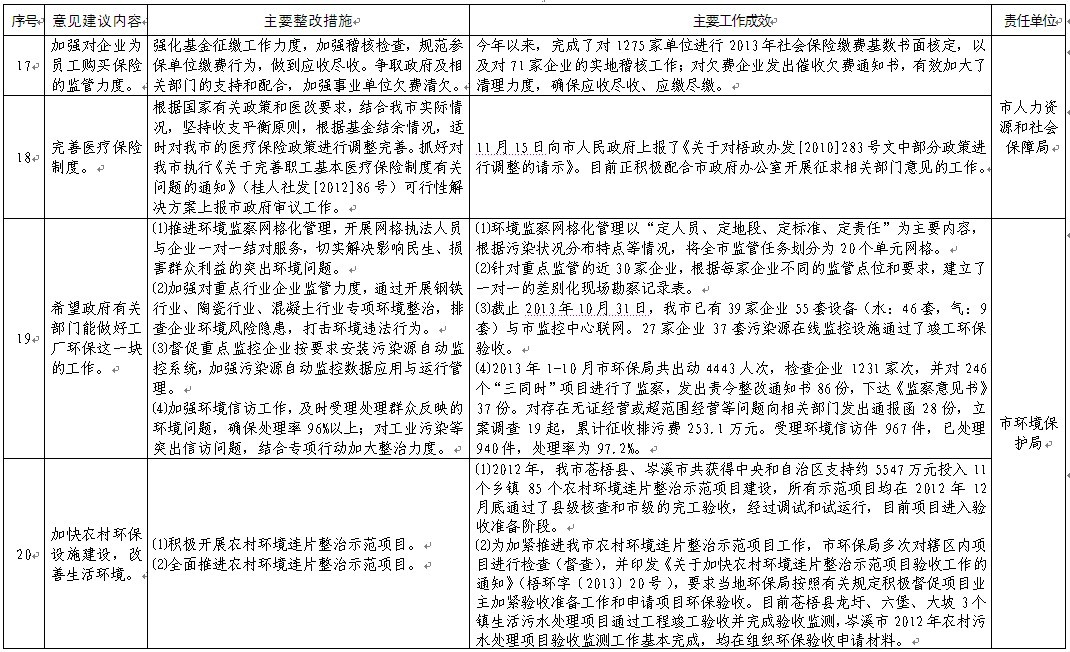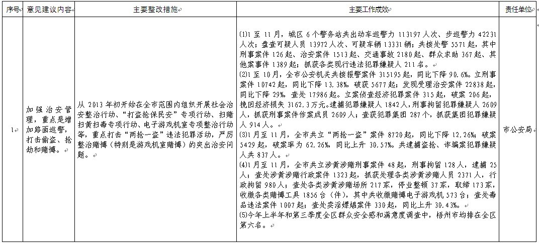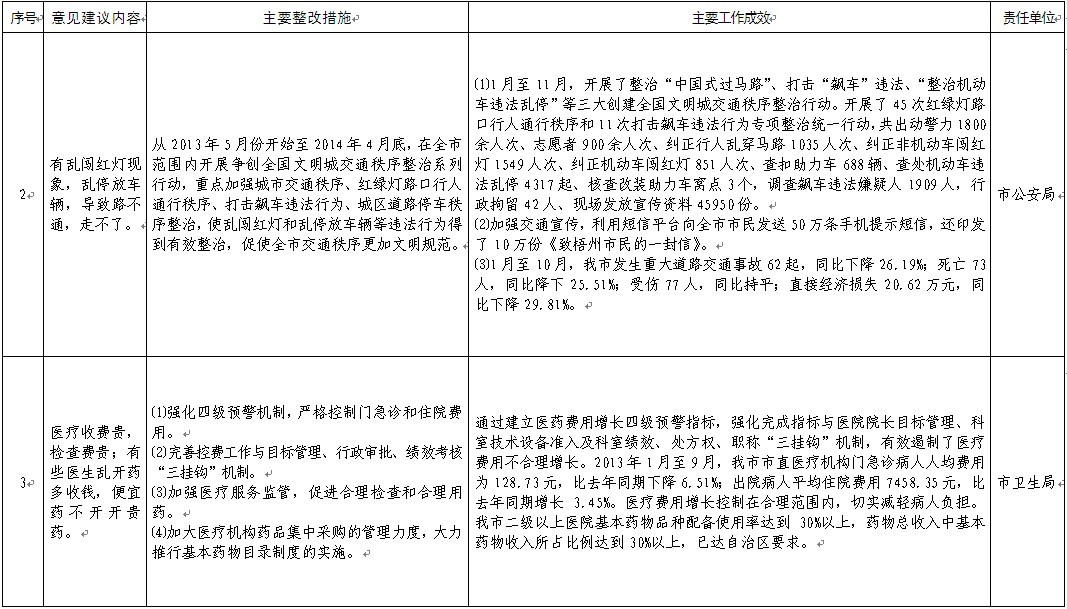 ?2012年度自治區績效考評公眾評議活動中,我市共收集到評議代表的意見、建議1272條,為認真應對社會公眾訴求,市委、市政府制定印發了《梧州市2012年度績效考評公眾評議意見建議整改工作方案》(辦發〔2013〕25號),對評議中群眾提出的的熱點、難點問題進行梳理歸類后組織開展整改。根據自治區績效辦要求,現將整改落實的情況公布如下,歡迎廣大干部群眾監督評議。