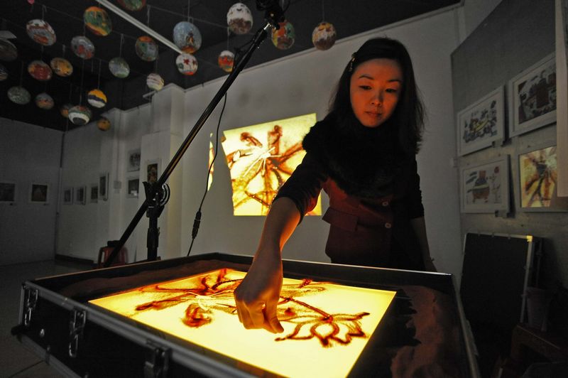 沙畫是傳統美術和現代聲光錄影技術的結合,表演者需要在專用的背光沙臺上以光作畫,用錄影設備拍攝,并在音響效果襯托下,用投影播放表演情景。