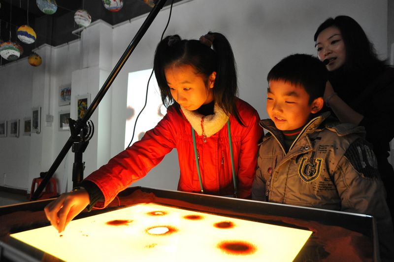 手握細沙,稍微松拳讓細沙緩緩漏下,一個小太陽便誕生了。但是這個簡單的圖案對于12歲的蘇芙來說有一定難度,“看老師示范很簡單,但到自己體驗時才發現,要控制好手中沙子的量并不容易,一旦把握不好,就會毀掉這個圖案。”
