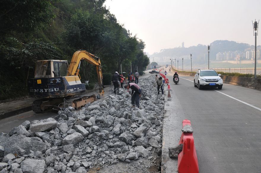 ?12月7日,在梧州龍母廟附近道路,工人正進行路面維修破拆。