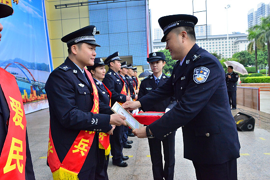 梧州零距離網訊(記者 覃燕霞 通訊員 曾亮)12月15日上午,我市公安局十大“愛民標兵”、十大“擁警模范”頒獎儀式在市政府廣場舉行,當選的20名先進典型一一上臺接受表彰。