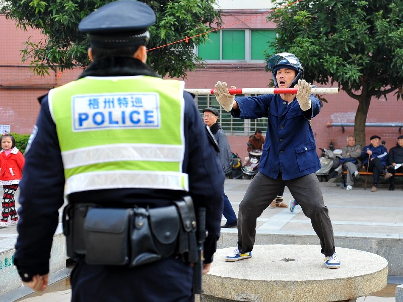 ????幾分鐘后,梧州市特巡警支隊多名民警趕到現場,馬上上前喝止男子離開圓臺,并奪下男子手中鐵管,不料男子竟馬上跪在地上,要求民警歸還鐵管。