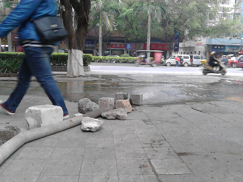 ????12月18日中午,記者現(xiàn)場(chǎng)看到,為了固定排水管,水管被七八塊水泥方左右固定,最大一塊水泥方高過(guò)嬰兒膝蓋,過(guò)往路人無(wú)不小心翼翼。一位腿腳不方便的阿婆,跨過(guò)水管時(shí)候猶如電影“慢動(dòng)作”一樣。