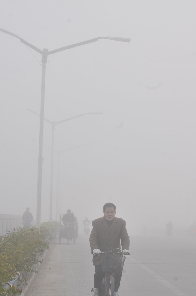 當日早上,人們在大霧中騎車經過桂江二橋。