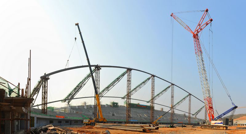 1月2日,大型起重機(jī)在施工現(xiàn)場(chǎng)進(jìn)行鋼結(jié)構(gòu)吊裝作業(yè)。當(dāng)日,記者在梧州體育中心建設(shè)工地了解到,場(chǎng)內(nèi)大型鋼結(jié)構(gòu)吊裝作業(yè)正在順利進(jìn)行,現(xiàn)場(chǎng)一臺(tái)作業(yè)高程接近100米的260噸級(jí)履帶起重機(jī)在場(chǎng)內(nèi)作業(yè)。