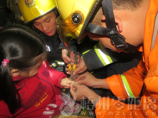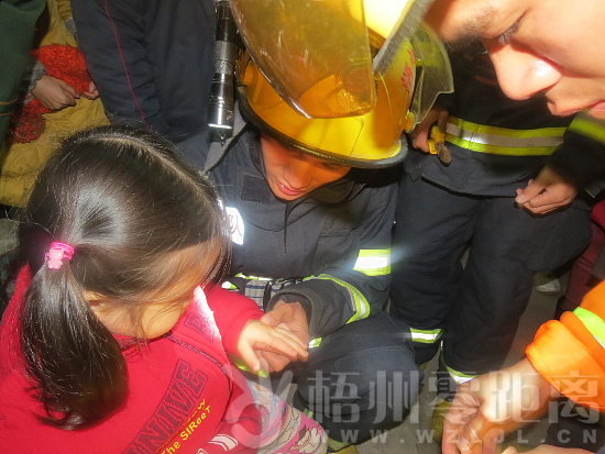 梧州零距離網訊(通訊員 李東)2014年1月1日元旦之際,晚上23時左右,梧州市消防支隊長洲中隊接到119指揮中心命令:位于梧州市新興二路豐業新苑小區,有一名小女孩的手指被卡住了,需要立刻前往救援。時間就是生命,長洲中隊立刻出動1輛搶險救援車、8名消防官兵前往處置。