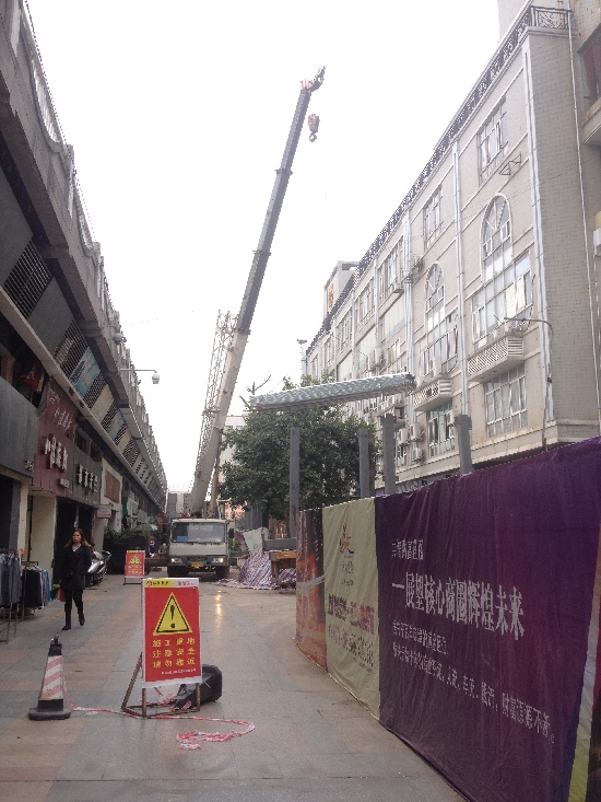 ????據悉,根據鴛江麗港特色街升級改造一期工程規劃,在鴛江麗港1號樓南側長約150米的步行街建起以鋼結構為主體、玻璃為間隔的綜合性商鋪。昨日,記者在施工現場看到,數根直徑約半米的巨型鋼條已矗立在地面,一臺大型吊機正配合施工人員運輸鋼條等建材。