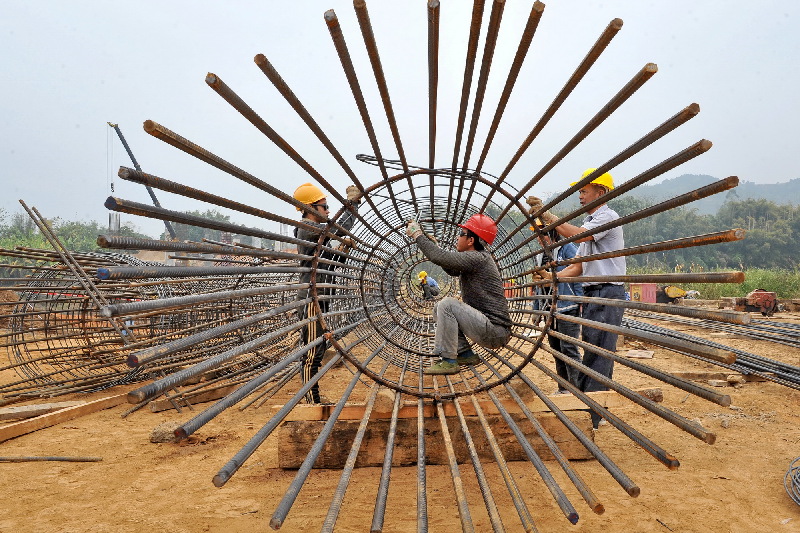 ????1月7日,在大園橋工程預制場,施工人員正捆扎鋼筋籠。