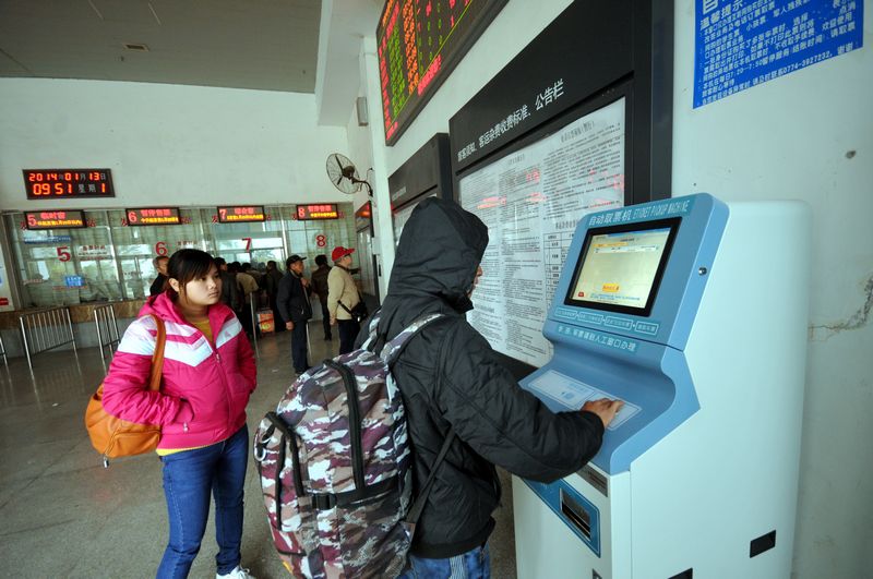 ?1月14日,通過梧州火車站售票大廳的自動售票機,旅客拿到之前從網(wǎng)上預訂的車票。2014年春運即將啟動,梧州火車站新近投入使用的自動售票機使旅客購票更加順暢。 記者 蒙紹松/攝