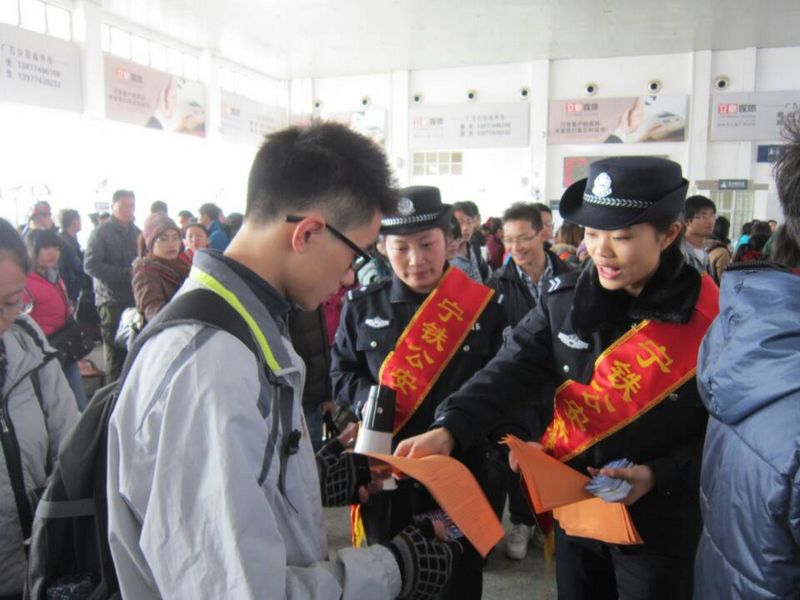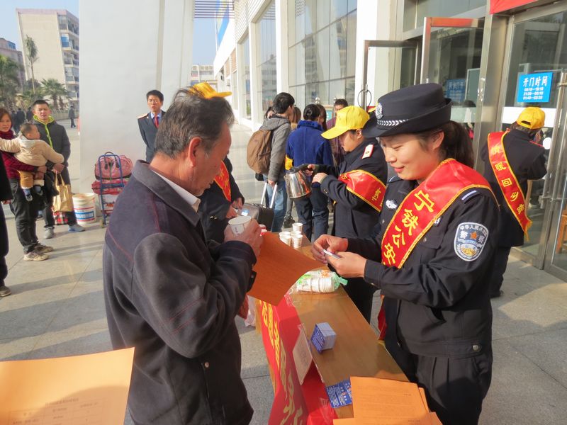 ????當(dāng)天,在梧州火車站民警為旅客群眾提供溫馨法律咨詢,同時(shí)設(shè)置青年志愿者服務(wù)臺(tái),根據(jù)旅客群眾的需要,為他們免費(fèi)提供熱開水、鐵警提示、防盜知識(shí)宣傳單等,為旅客出行提供優(yōu)質(zhì)安全、方便地服務(wù)。