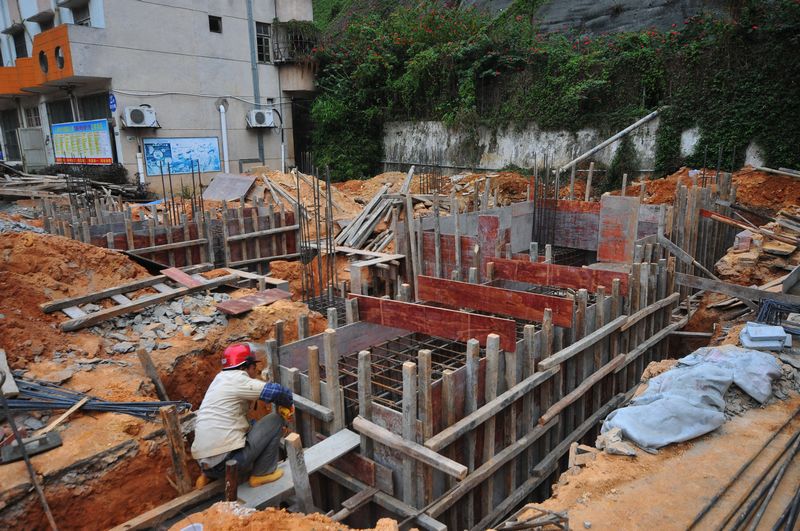 1月13日,在文瀾路小學(xué),工人正搭建新校舍的地基模板。