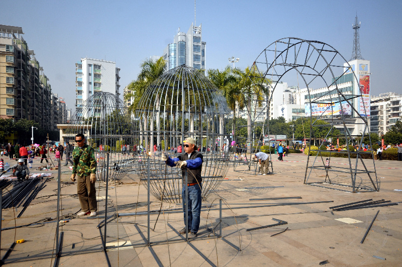 ??? 1月19日,工作人員在市政廣場焊接迎節景致的鋼筋結構。2014年春節臨近,梧州市政部門開始在市區部分地段布置迎節景致,為春節期間營造喜慶的節日氣氛。 西江都市報記者 蒙紹松/攝